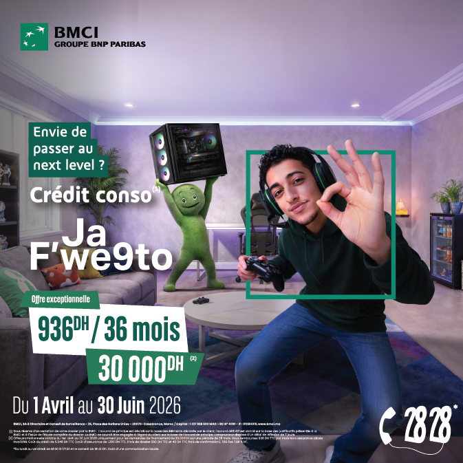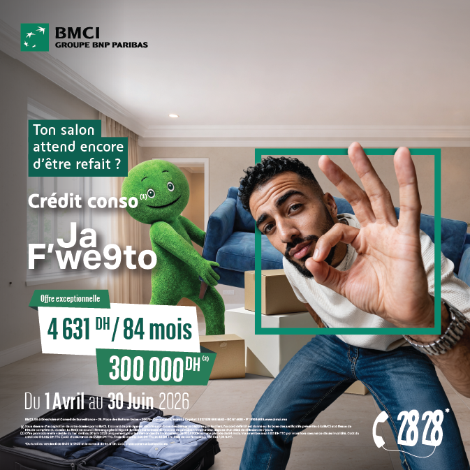 BMCI, SA à Directoire et Conseil de Surveillance - 26, Place des Nations Unies – 20070- Casablanca, Maroc / Capital : 1 327 928 600 DH - RC N° 4091 - IF : 01084015. www.bmci.ma (1) Sous réserve d’acceptation de votre dossier par la BMCI. L’accord de principe est décidé sur la base des éléments déclarés par le client, l’accord définitif est donné sur la base des justificatifs présentés à la BMCI et à l’issue de l’étude complète du dossier. La BMCI ne saurait être engagée à l’égard du client sur la base de l’accord de principe. L’emprunteur dispose d’un délai de réflexion de 7 jours. (2) ) Du lundi au vendredi de 8h30 à 17h30 et le samedi de 9h à 13h. Coût d'une communication locale.